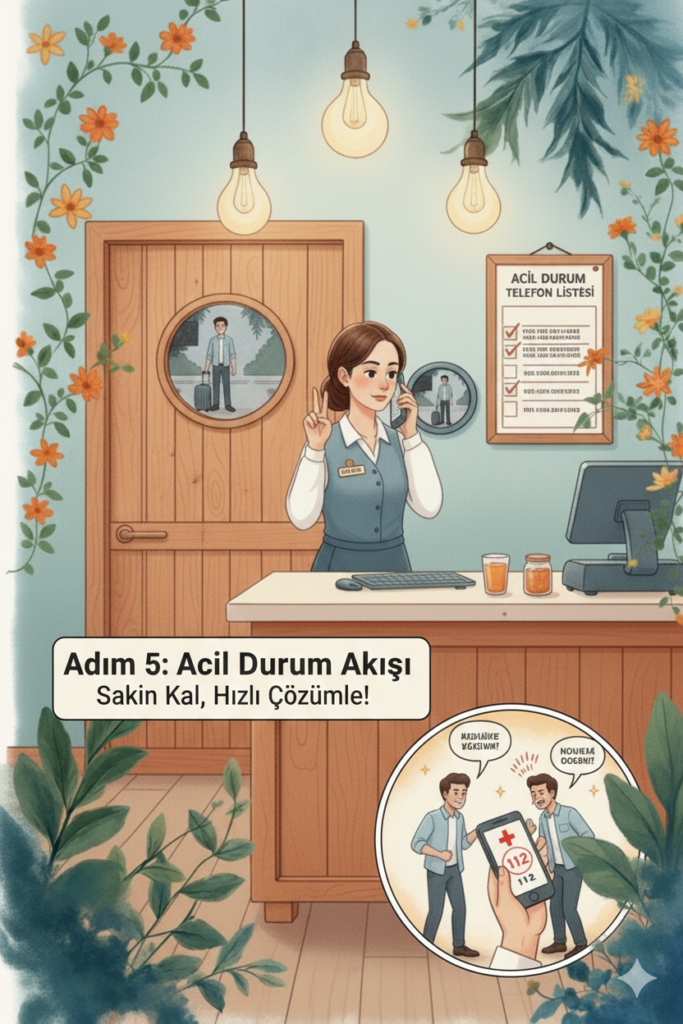 - Sağlık Problemi: Misafir veya personelin ciddi bir sağlık sorunu varsa, hemen 112’yi arayın ve durumu otel yöneticisine bildirin. Misafirin yanından ayrılmayın, ona destek olun.