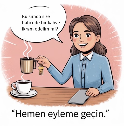 - Nasıl Uygulanır? “Hemen [Odanızı değiştiriyorum / Teknik ekibi yönlendiriyorum]. Bu sırada size bahçede bir kahve ikram edelim mi?”