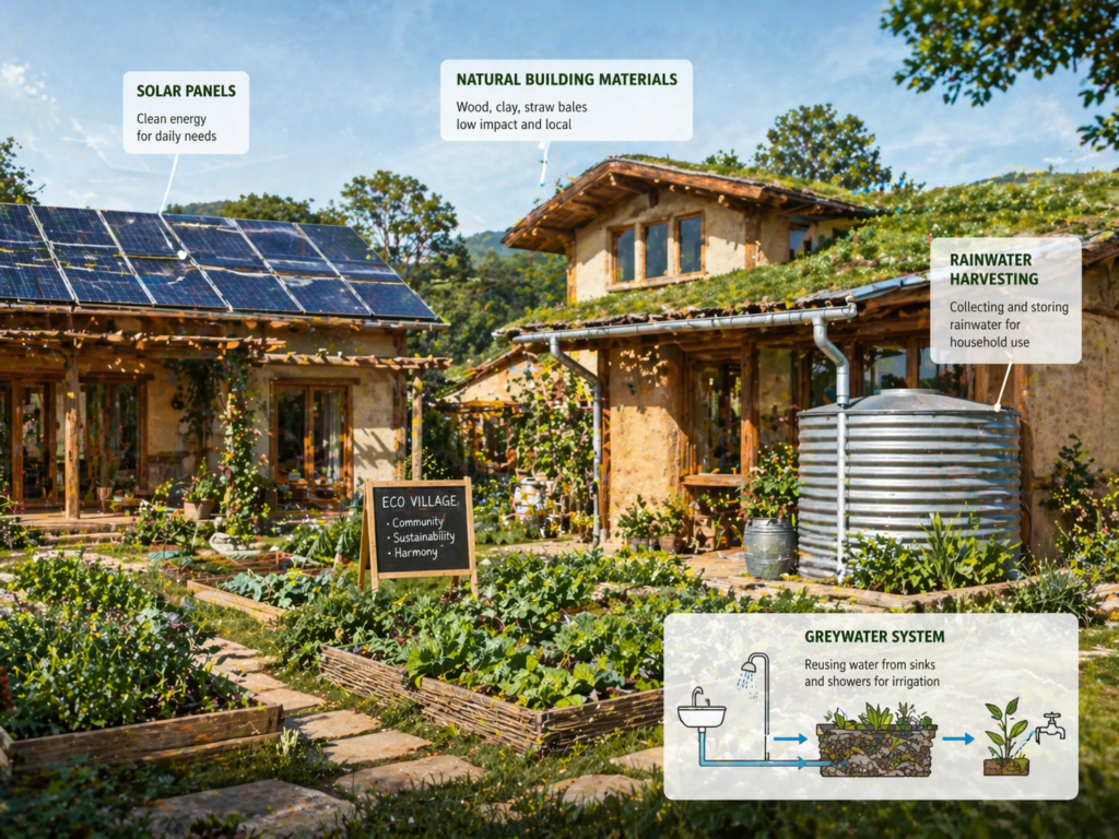 Bir eko-köyün fiziksel yapısı, ekolojik prensipleri yansıtmalıdır. Bu, sadece “yeşil görünmekten” çok daha fazlasıdır; kaynakların verimli kullanımı ve atıkların minimize edilmesi ile ilgilidir.